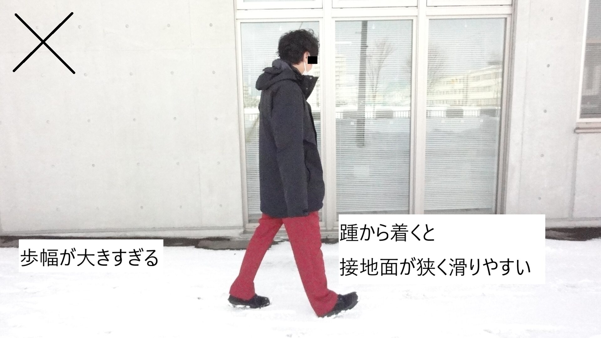 雪や地面の凍結がない時期に歩行する際は、「胸を張って歩幅を大きく踵から足を着いて」というような歩き方が理想であるイメージが強いと思います。