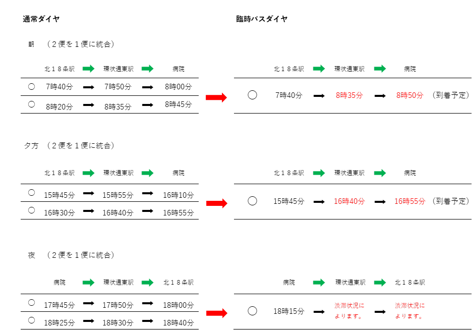 交通状況が回復次第、従来のダイヤに戻す予定ですので大変ご迷惑をおかけいたしますがご理解・ご協力を宜しくお願い致します。